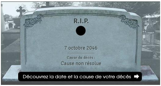 Pendant que tu y es, tu as testé une application sur internet pour connaitre le jour de ta mort et la cause de ton décès. Ca a donné ça.